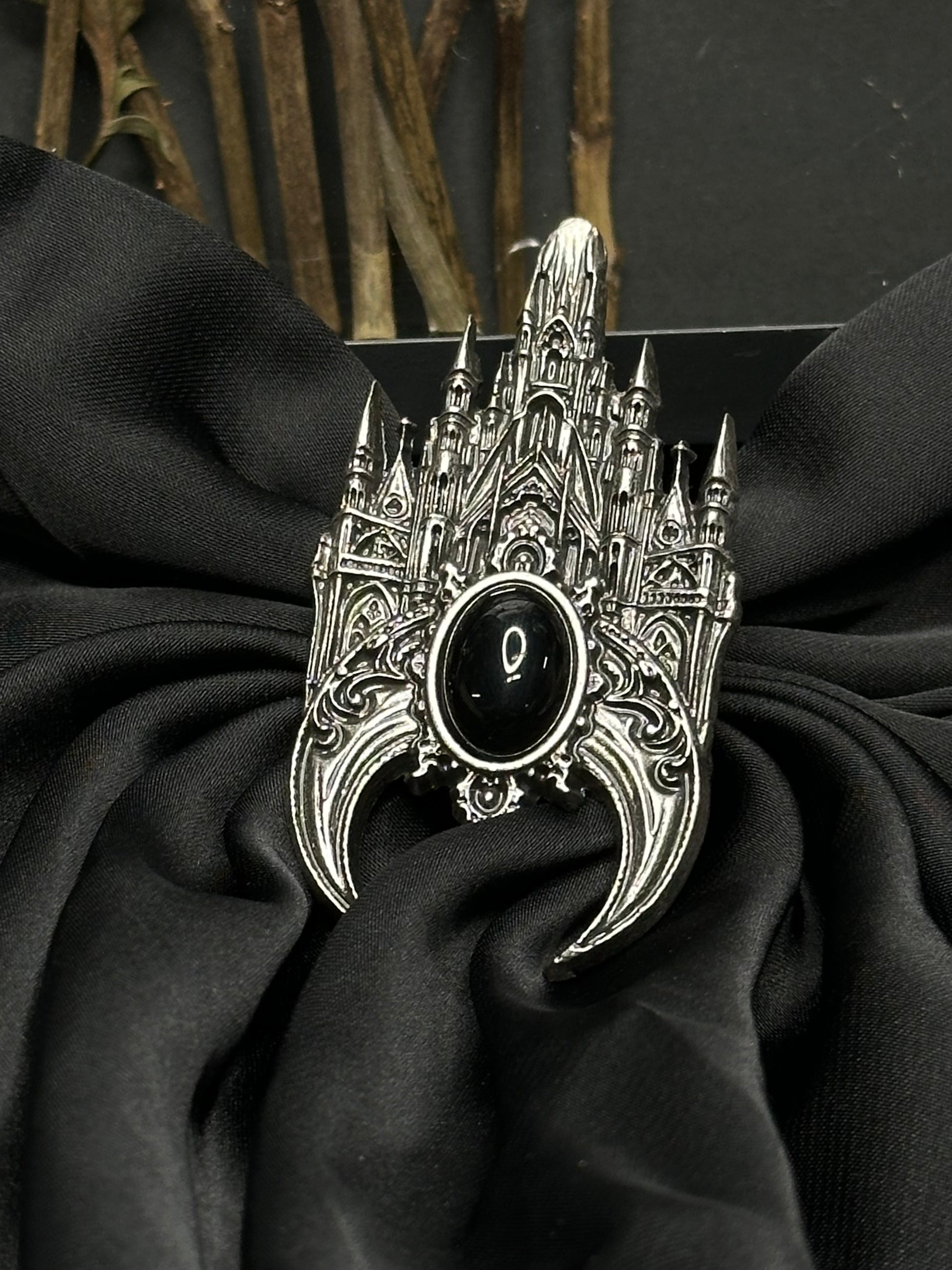 Capturing the true gothic architecture of a European cathedral built centuries ago and a smooth obsidian stone in front of a crescent moon.