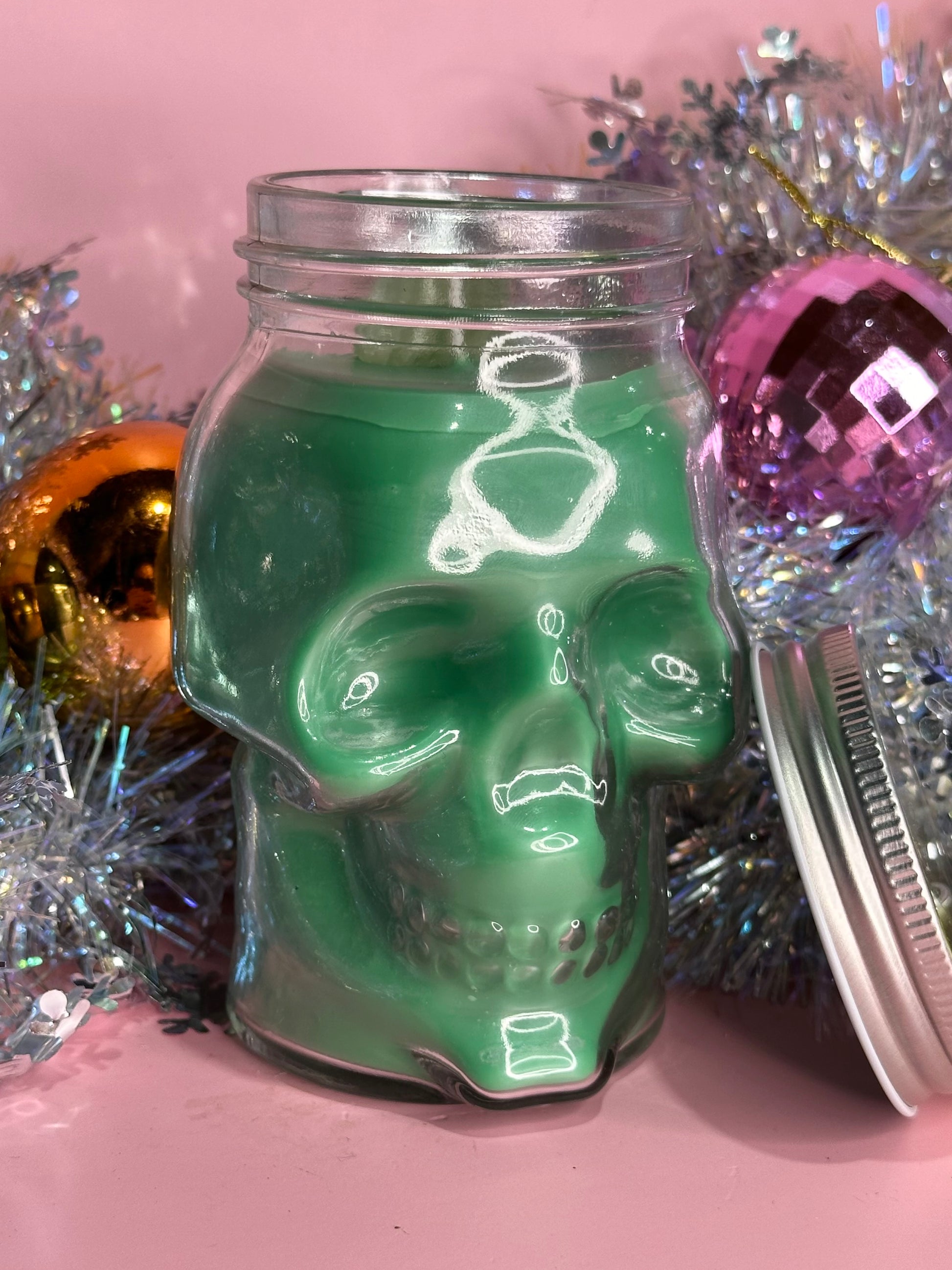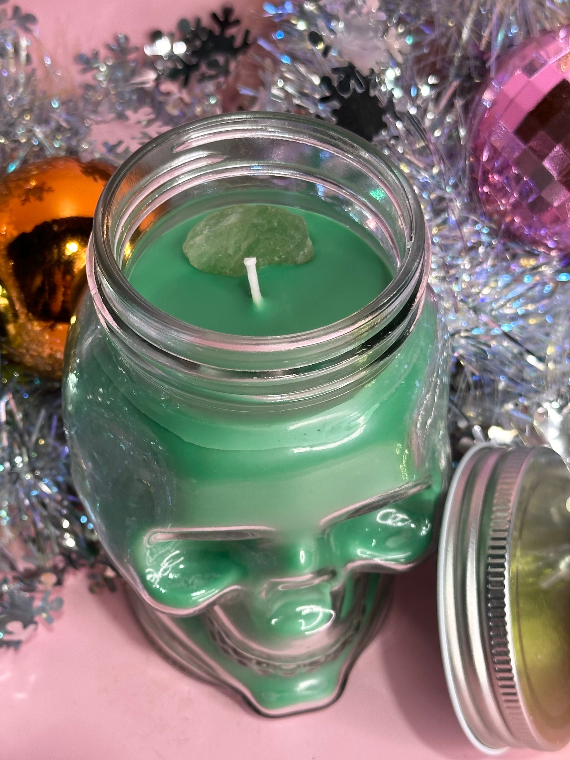 This beautiful hand poured candle is 100% soy wax, topped with a chunk of genuine adventurine in a glass, skull shaped, reusable vessel.