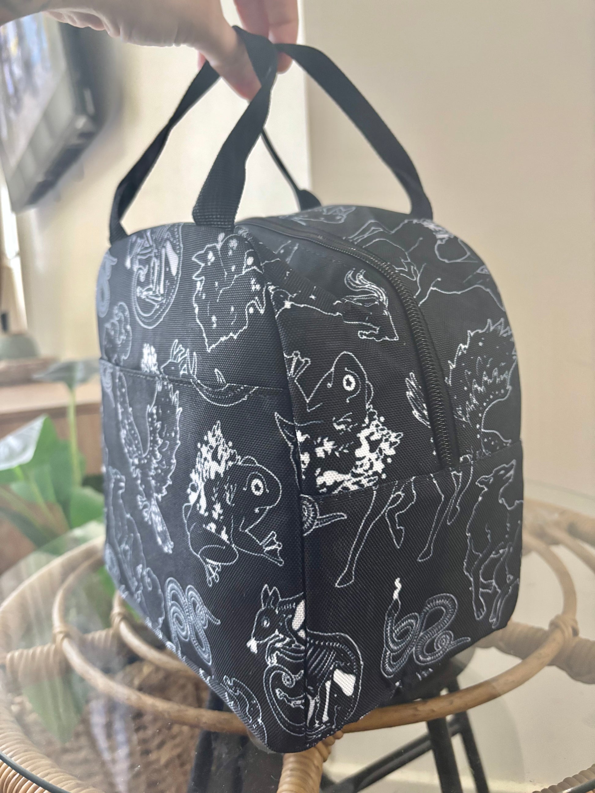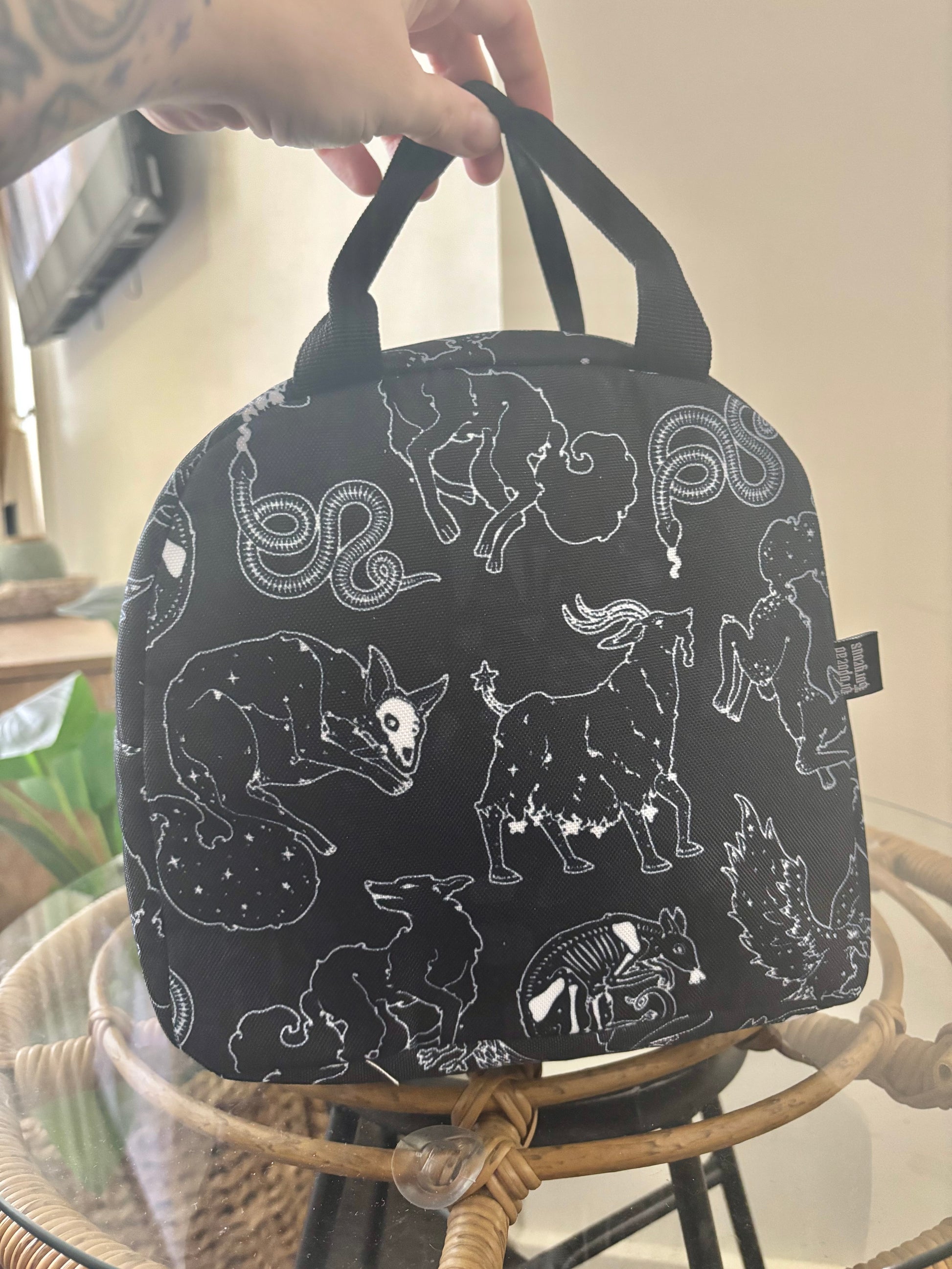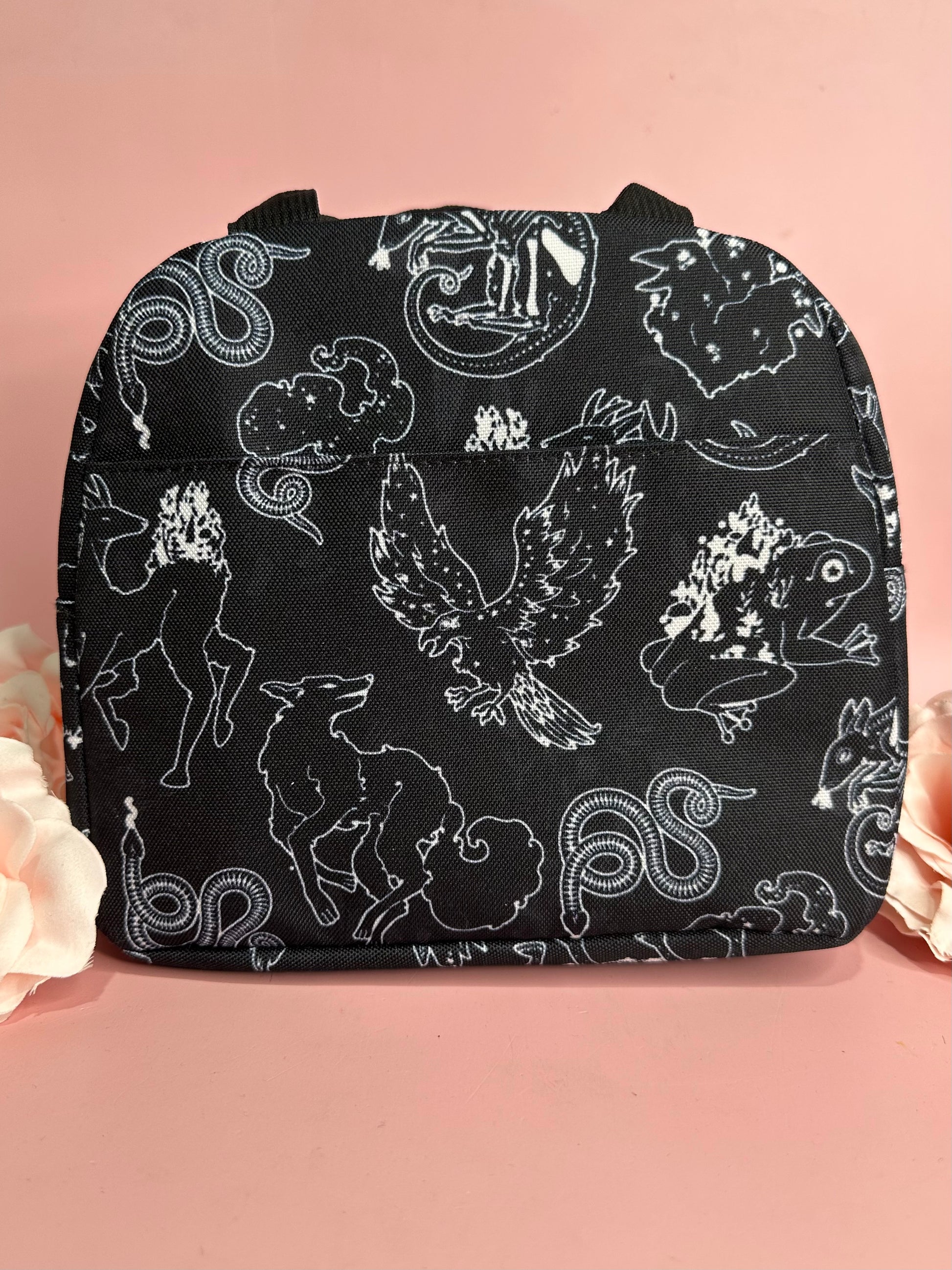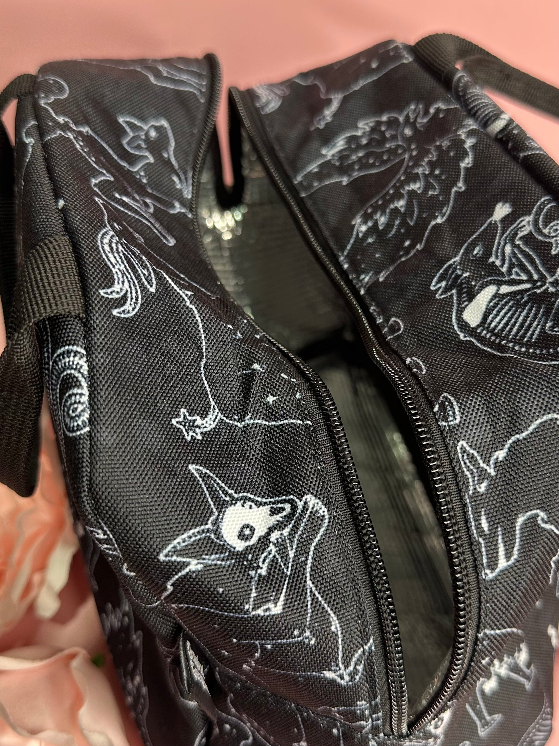 Spend your lunch time in magical style with our insulated, zipper top lunch bags! Heavy duty poly canvas construction with insulated lining to keep your lunch either cold as the night or hot as hell.