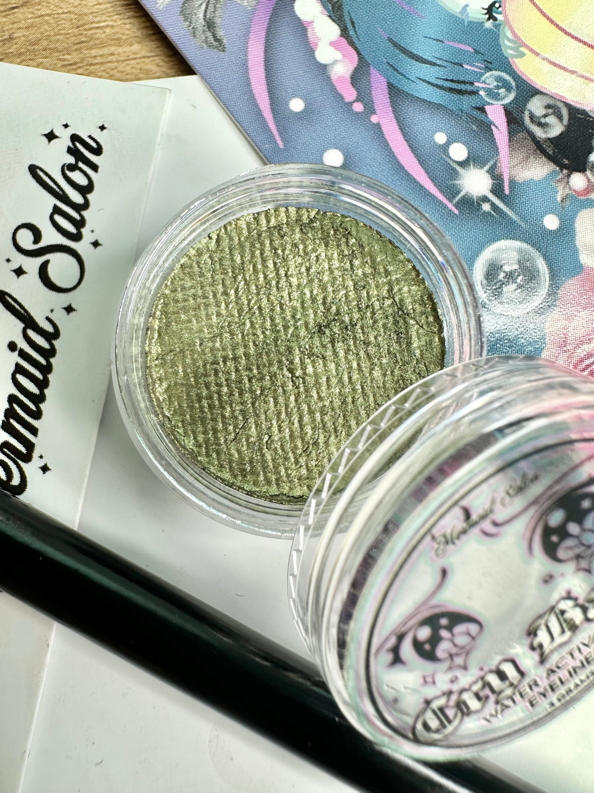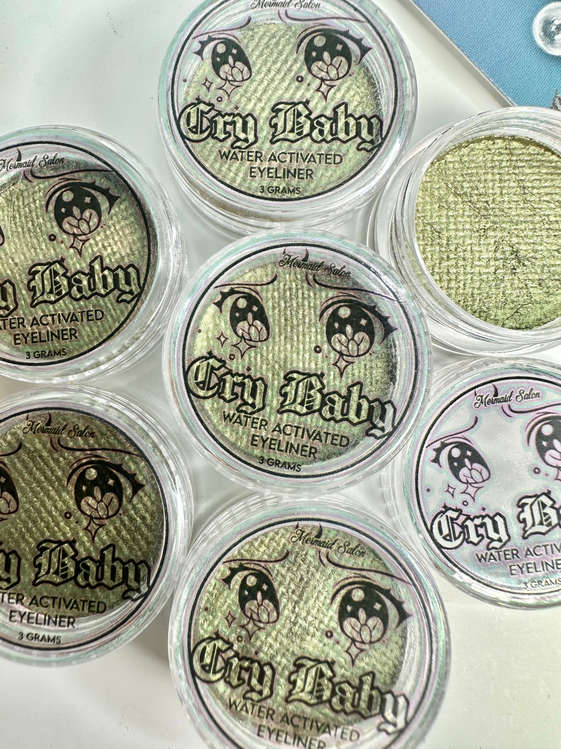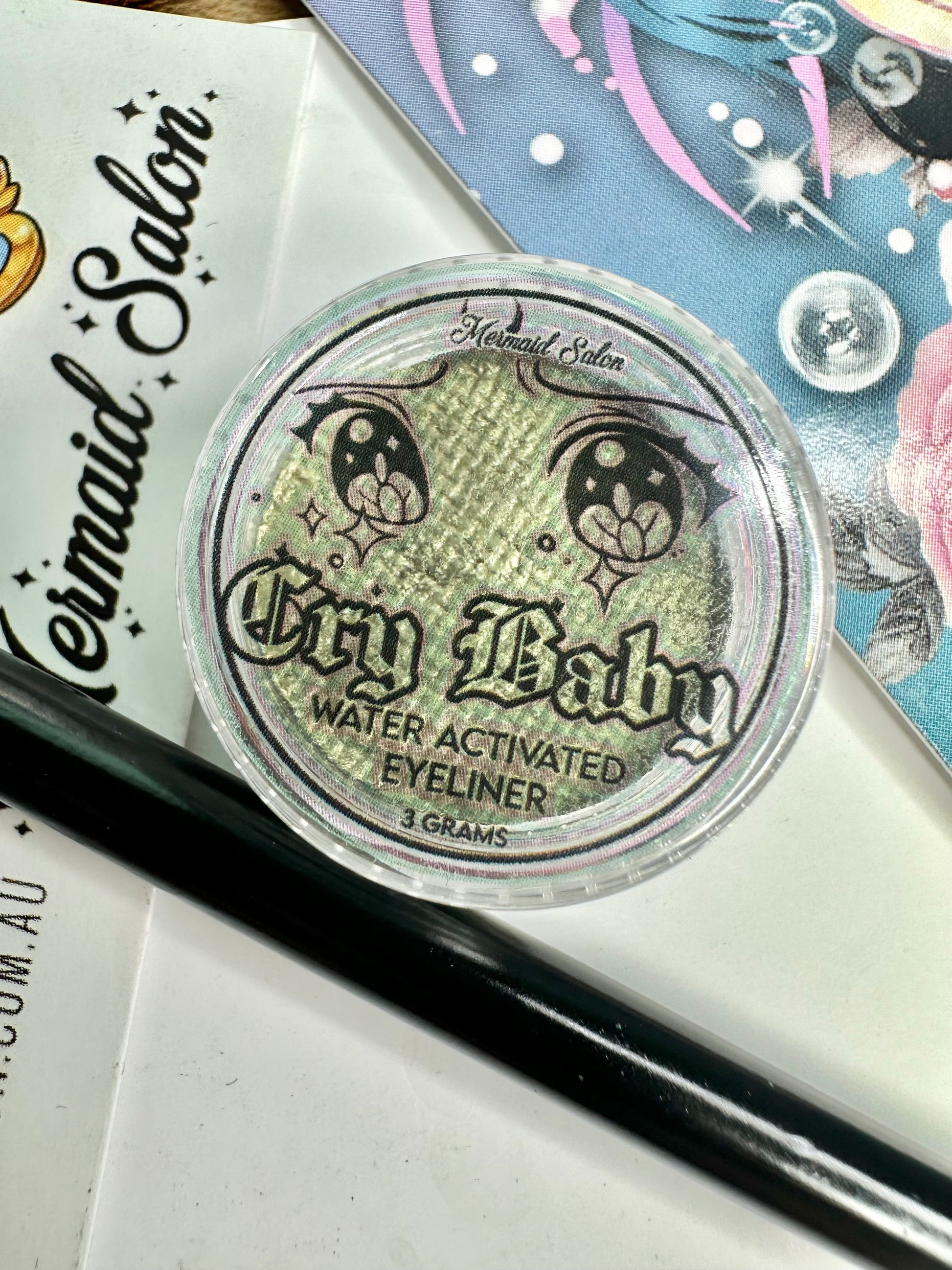 Mermaid Salon CryBaby Aqua-Liner is a traditional eyeliner / face paint hybrid. Cauldron smoke is a beige to lilac to aqua pastel shift.