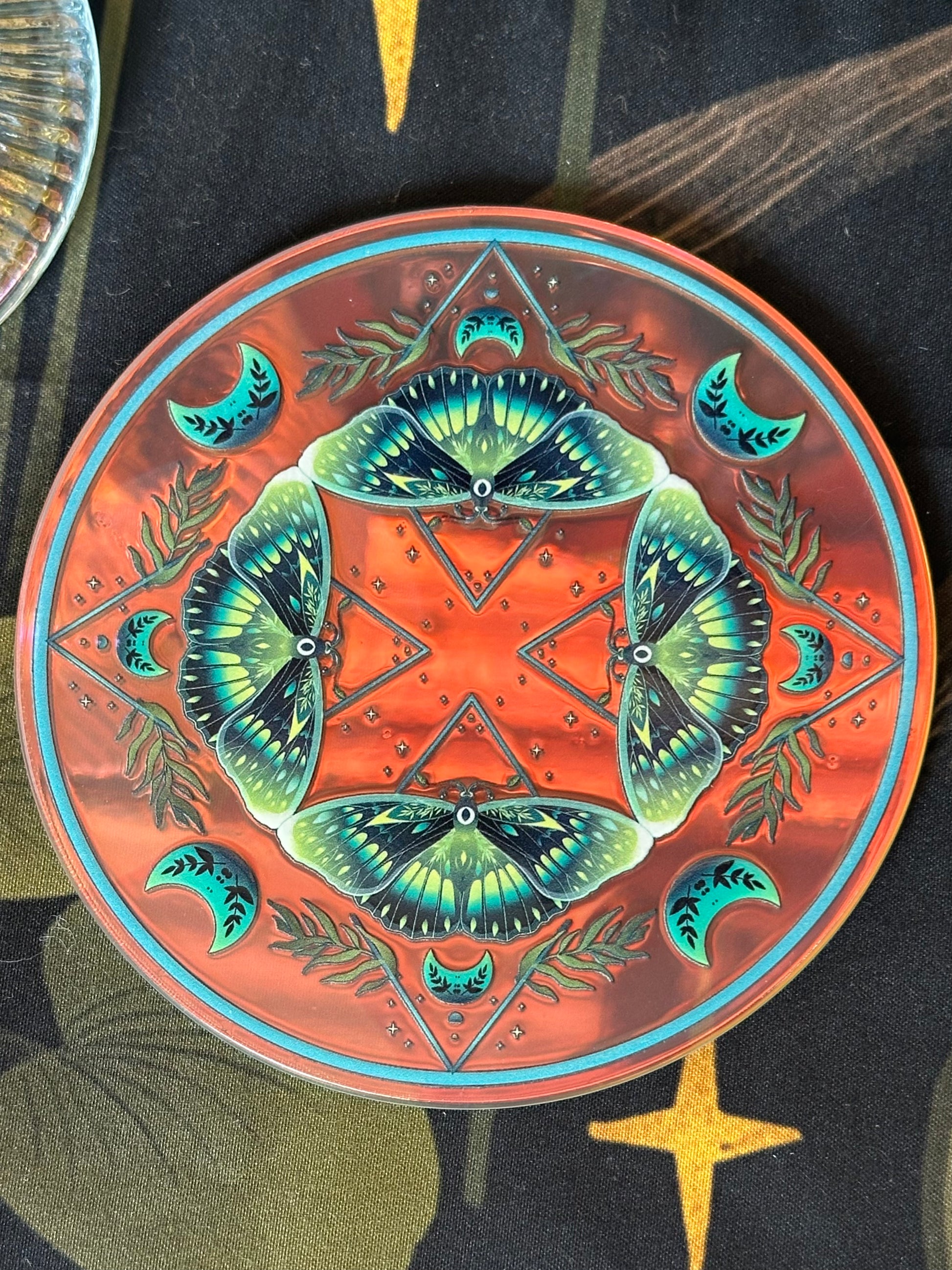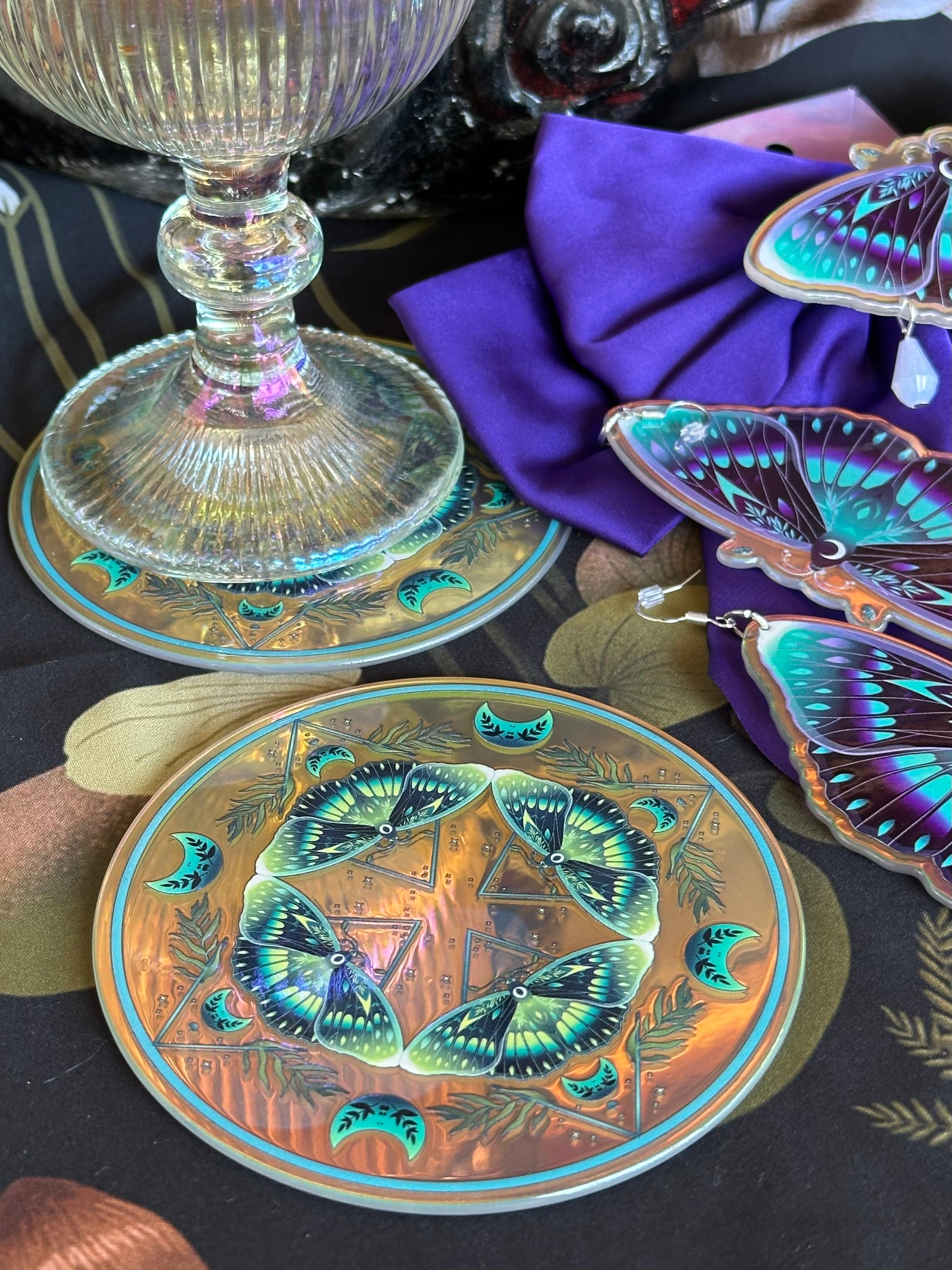 Add a touch of futuristic flora & fauna with these gorgeous holographic butterfly coasters. Featuring a multi-colour holographic base and kaleidoscopic design of butterflies & moons; these sleek coasters are the perfect feature for your dining room, kitchen or bar!