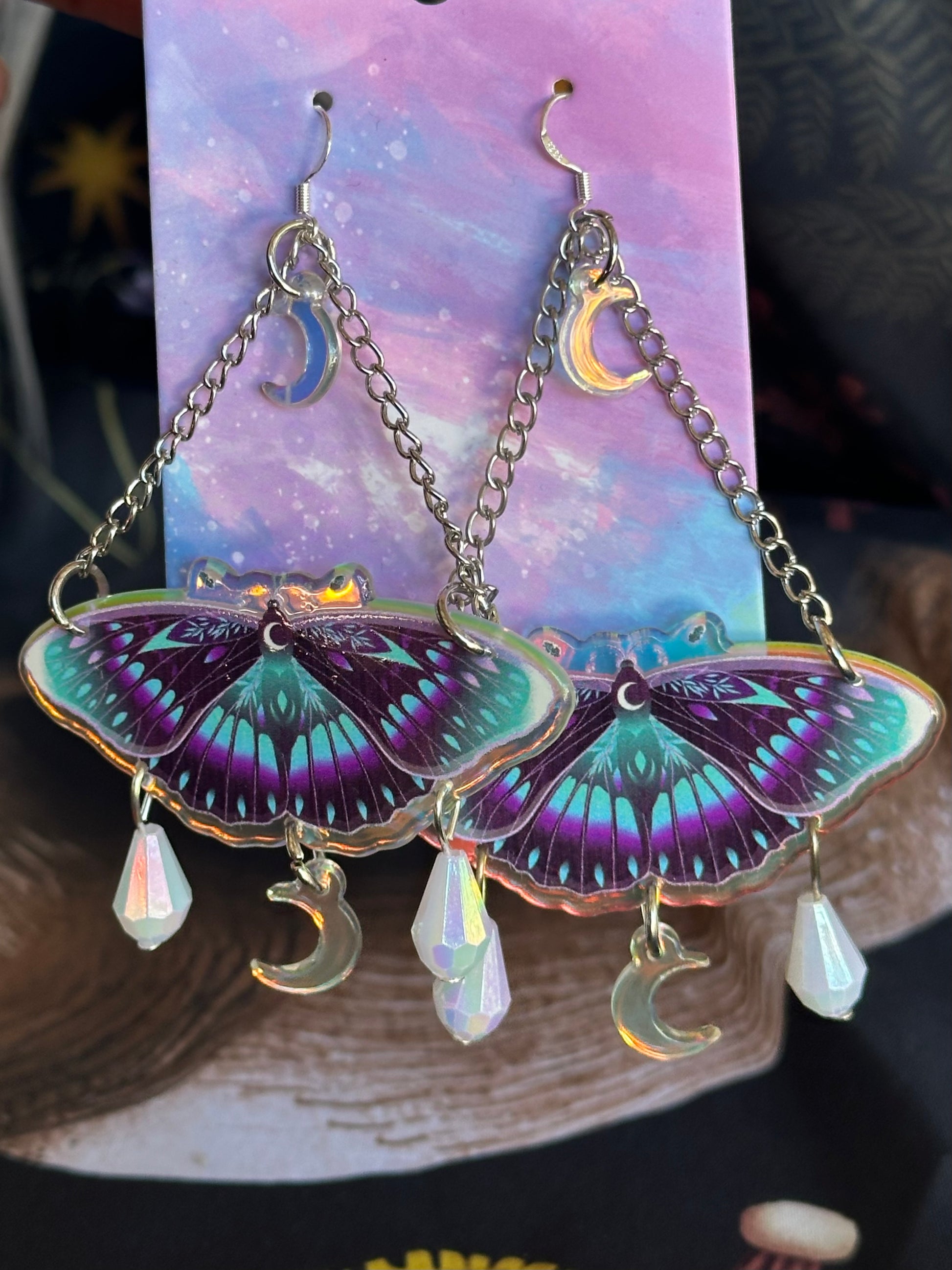 Find yourself being the flutter about town in these La Bella Luna Dew Drop Chain Earring. With beautiful hues of blues and purples dancing amongst holographic jewels and crescent moons, these gorgeous earrings will have you feel ever so effervescent.