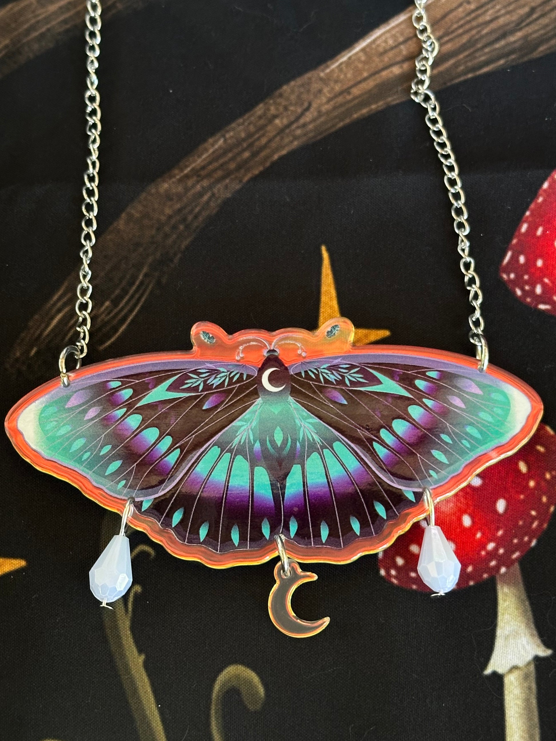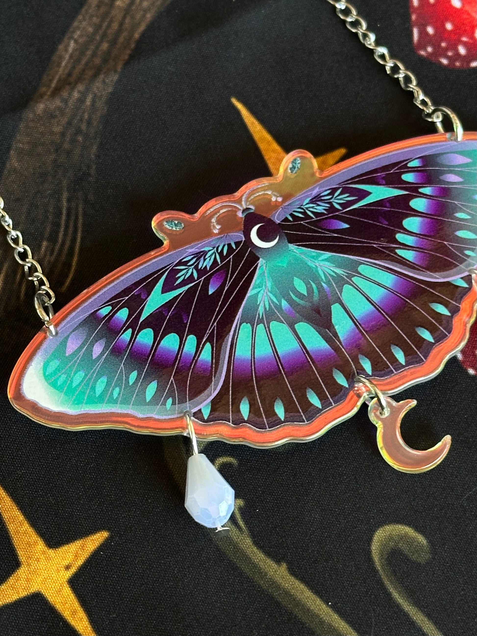 Flutter about town with this gorgeous La Bella Luna Dew Drop Necklace. Bursting with bright blues and purples, this beautiful necklace dances amongst a beautiful crescent moon & holographic gems.