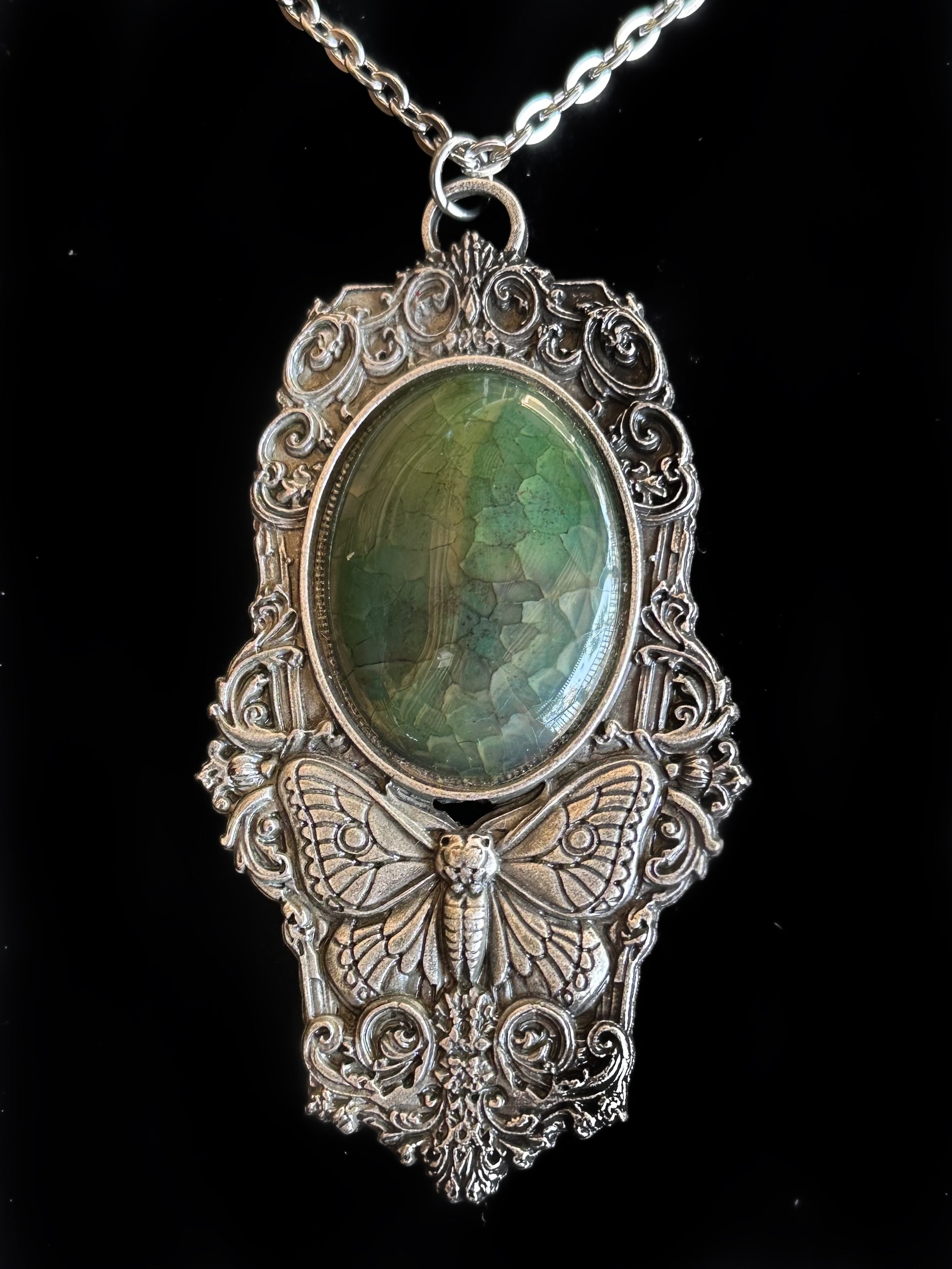 A large genuine Dragon’S Vein Agate stone set, with resin inside a custom MOTHER OF HADES overgrown coffin pendant. With a small moth friend.