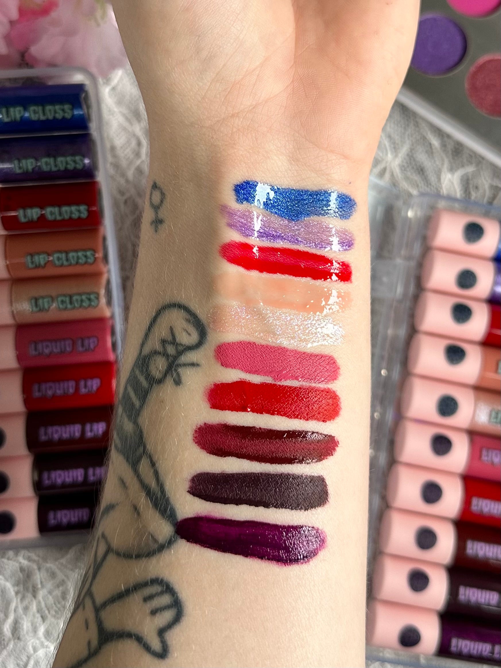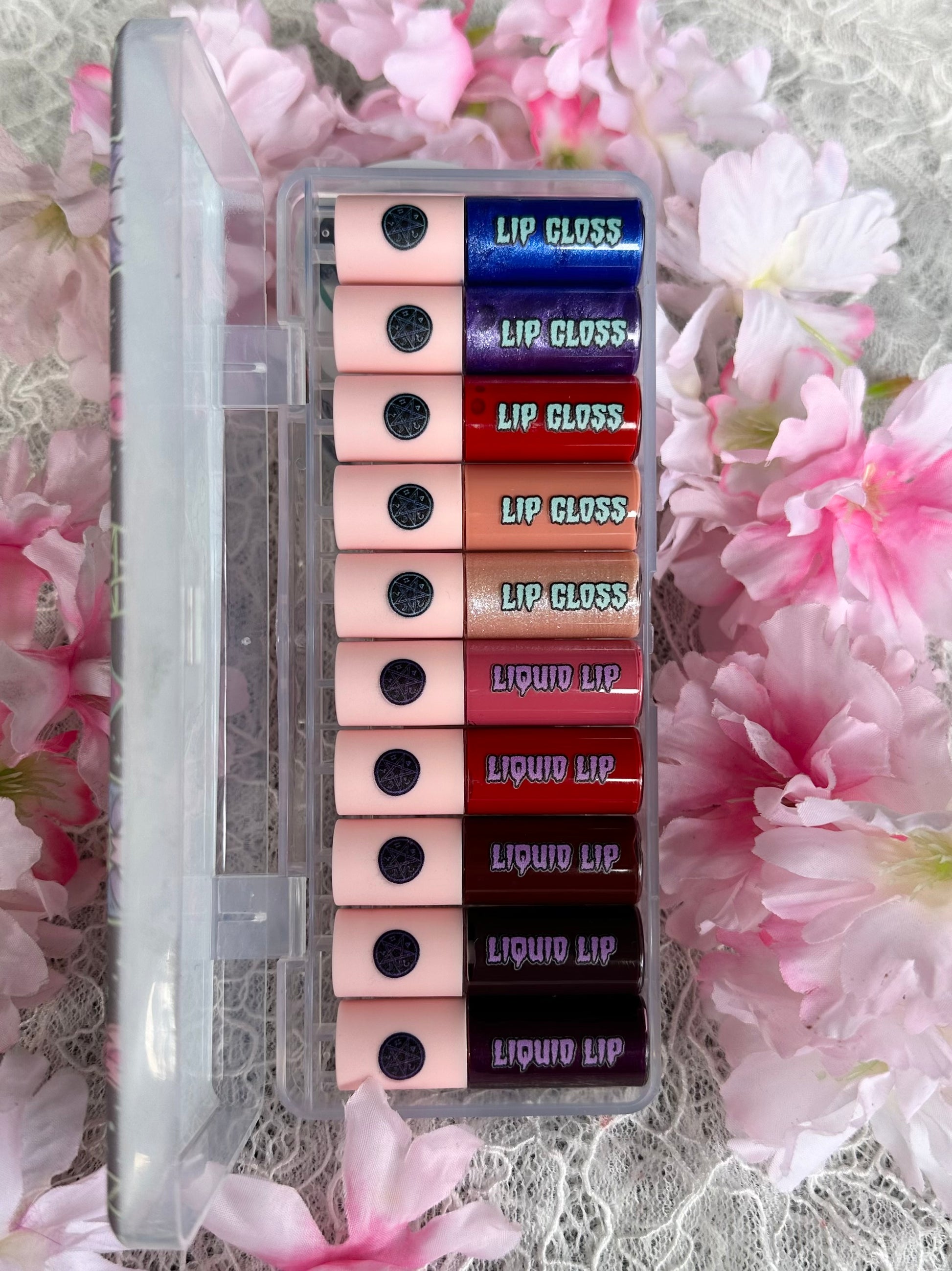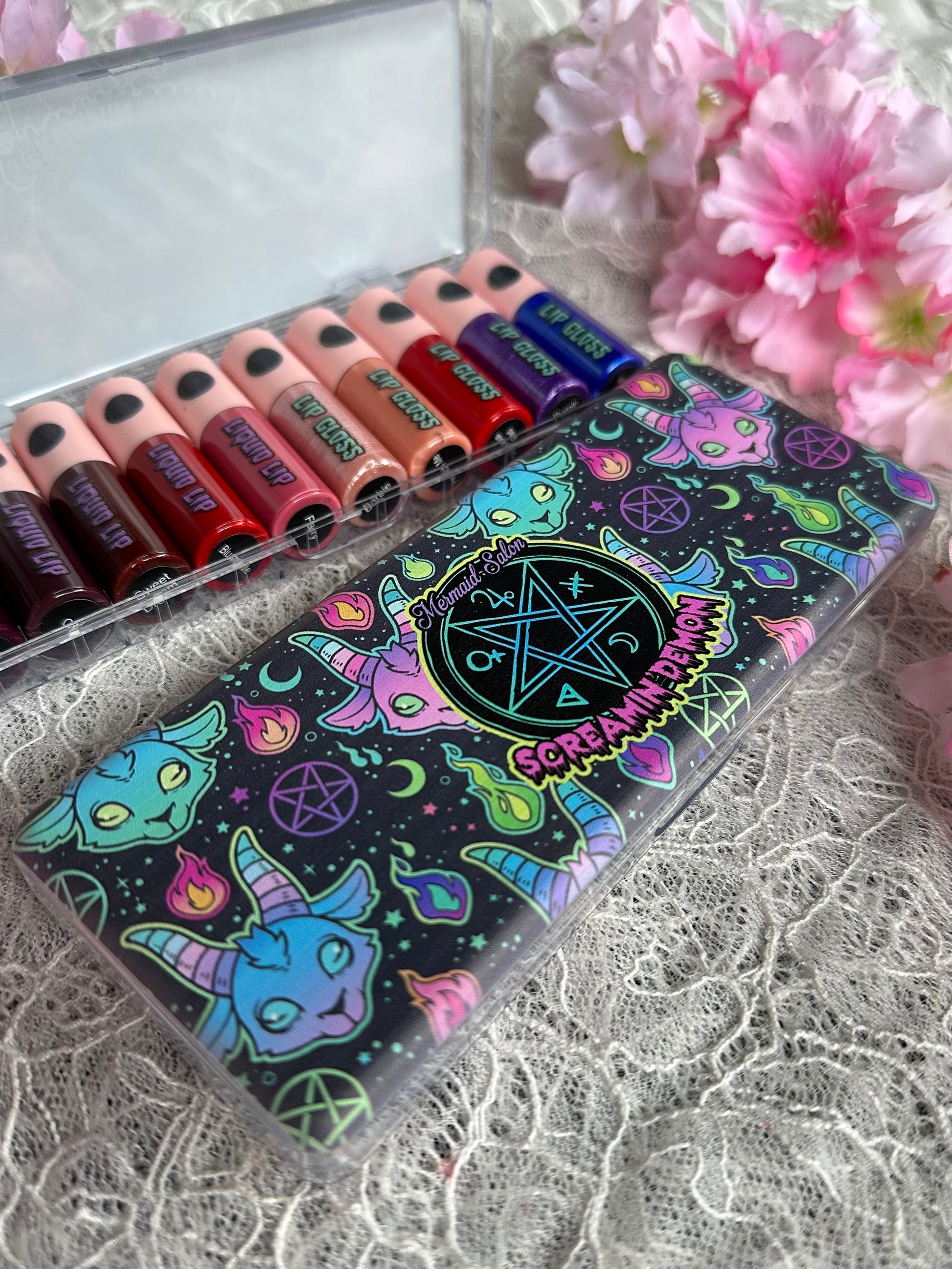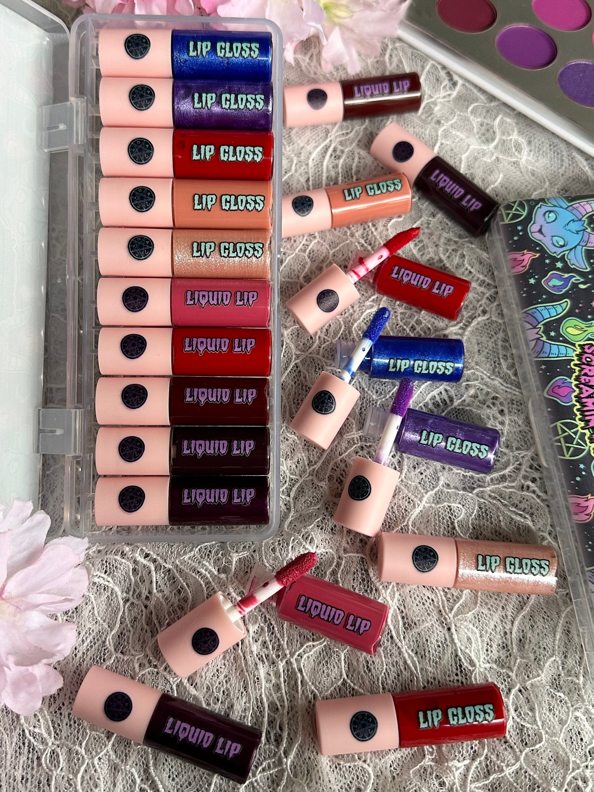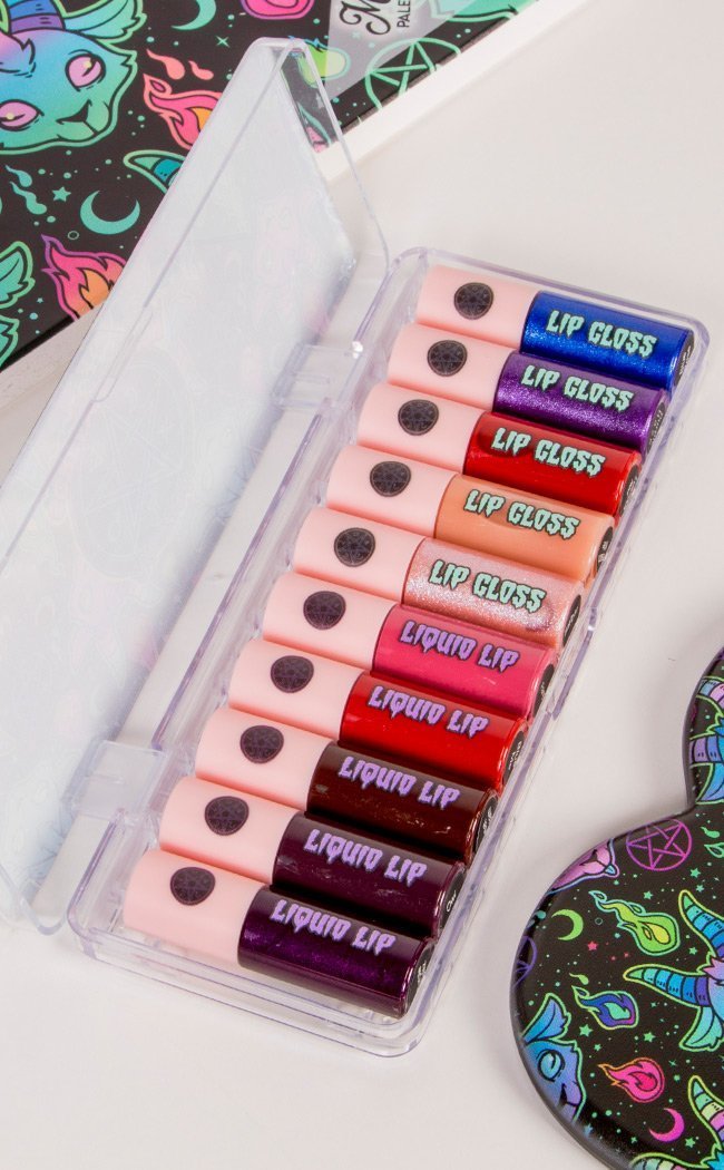 This huge collection is 10 lippies full of pigment, glam and sin! Coming in packaging decked out in neon occult art, you will receive 5 liquid lipsticks and 5 lip glosses. Dip yer toes into bright shades and demure neurtals for dramatic and casual looks.
