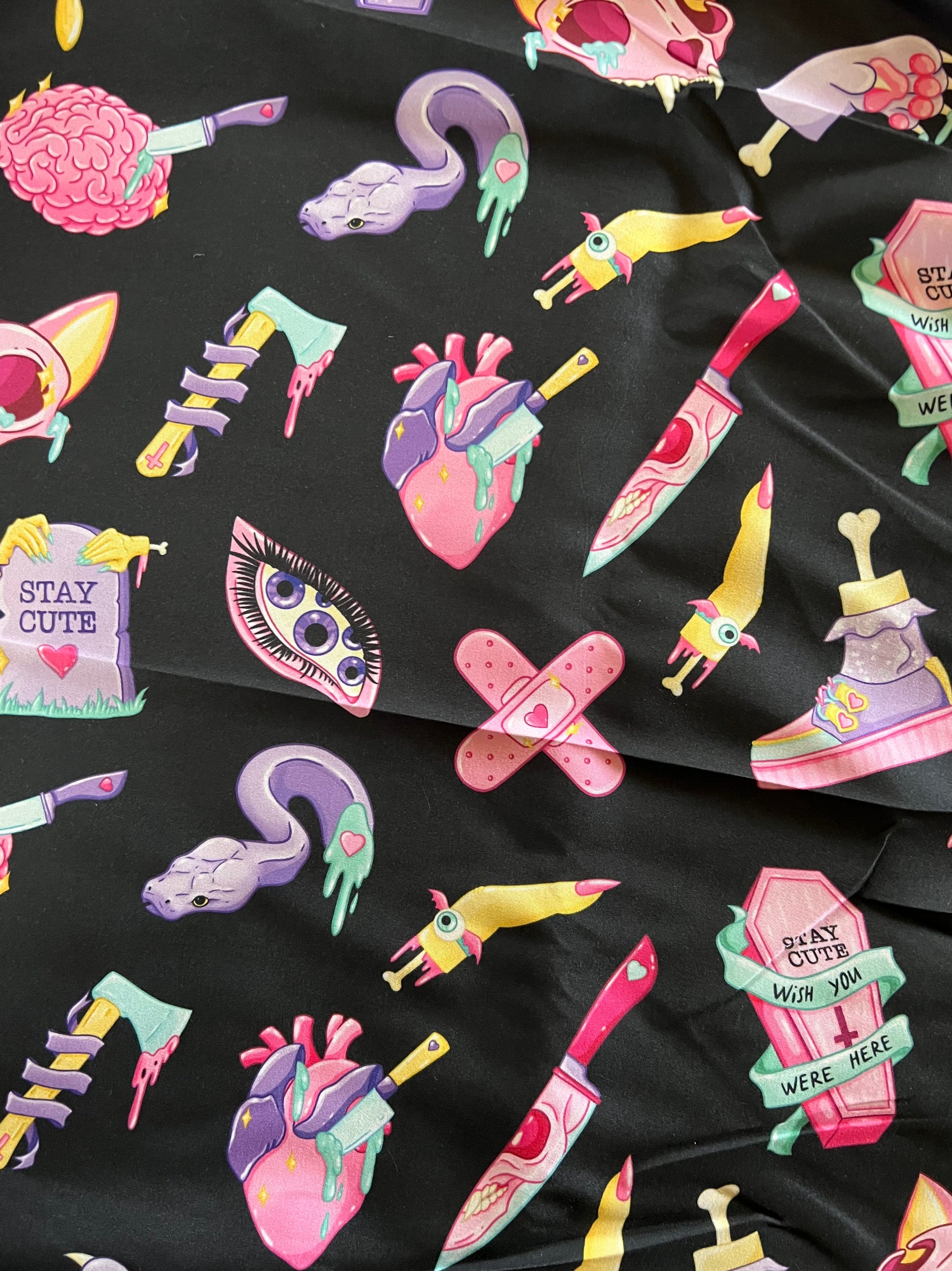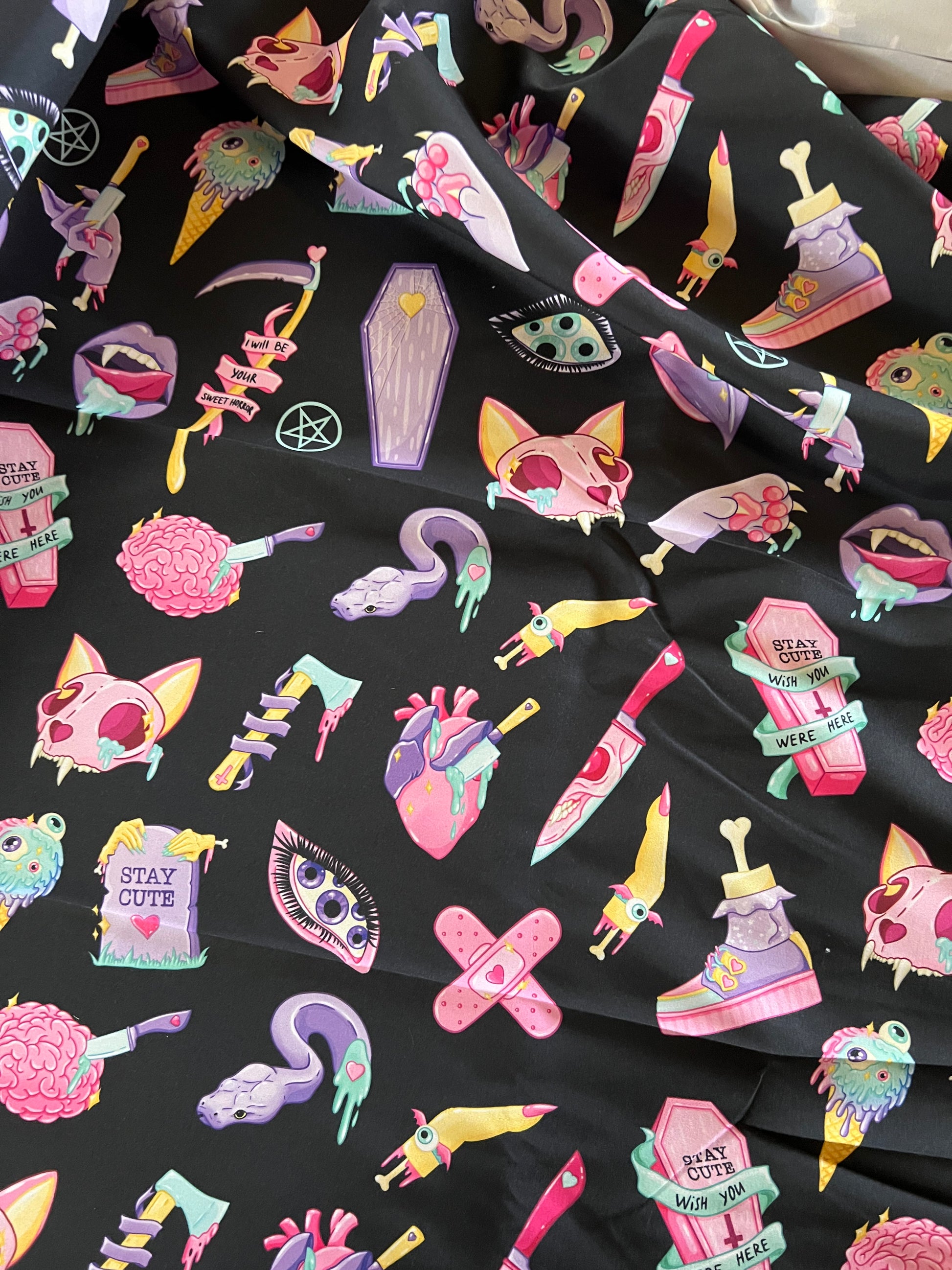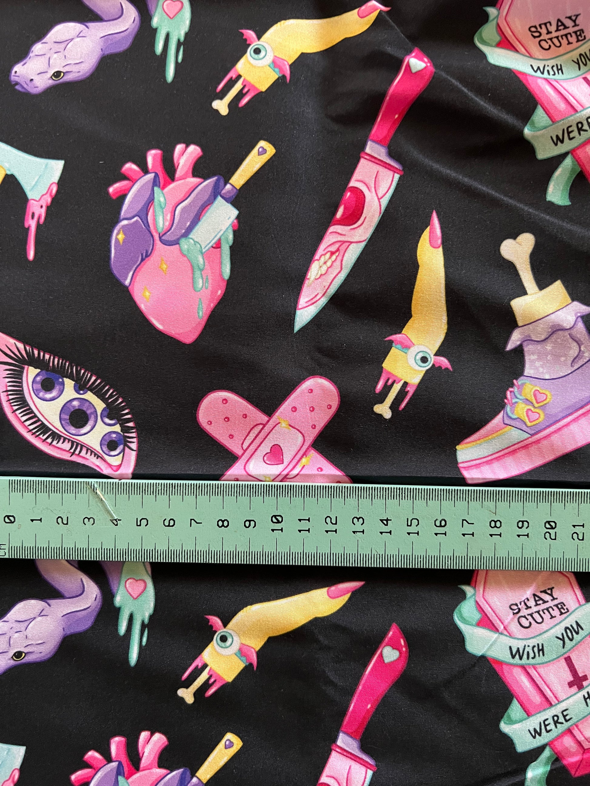 145cm wide. poly cotton blend - feels a bit like a heavy poplin.